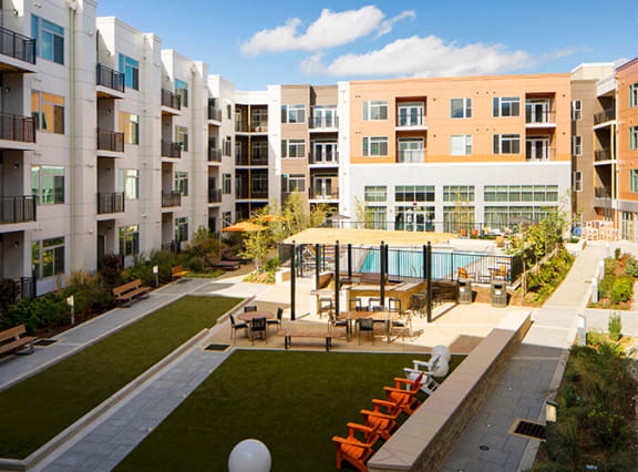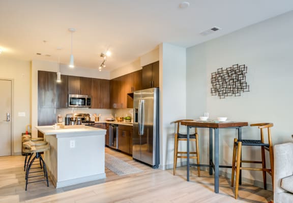 Your apartment, in turn, is home to an array of smart details and creative options that make living an all-inclusive affair. The movable kitchen islands and walk-through closets boost the space to give you more room to roam, the quartz countertops, French-style refrigerator doors, and plank-wood flooring create a modern design aesthetic, while the Energy Star appliances, efficient lighting fixtures, and water-saving plumbing reveal our pledge to sustainability. Not to mention that each unit boasts its own washer and dryer, so you can shift your focus from chores to unwinding.